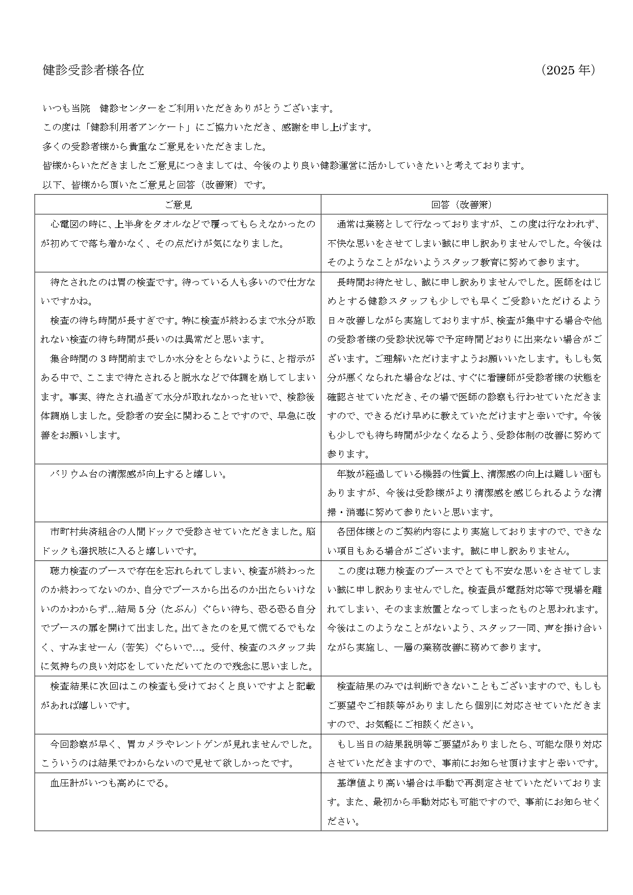 受診者の皆様からご意見をお伺いし、より良い運営を行うため、アンケートを実施いたしました。