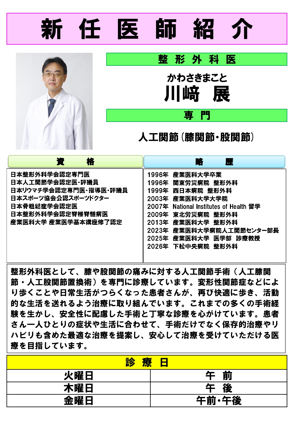 2026年4月1日より、当院整形外科に川崎 展医師が加わりました。