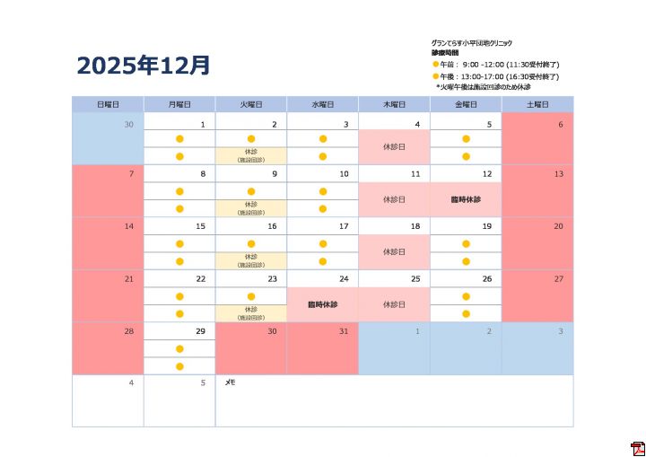 ニュースリリース ← 戻る 12月の診療予定【12/12 12/24臨時休診 12/29は午前午後診療いたします】 お知らせ 2025/11/21 12月の診療予定です。12/12金 12/24水 は恐れ入りますが休診とさせていただきます。年内は12/29月 まで診療いたします ご不便をおかけいたしますが何卒宜しくお願い申し上げます。 [登録日] 2025/11/21 | 固定リンク