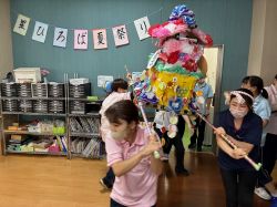 ご利用者様たちと作成したお神輿を担いだり、ボールすくいなどをして楽しみました