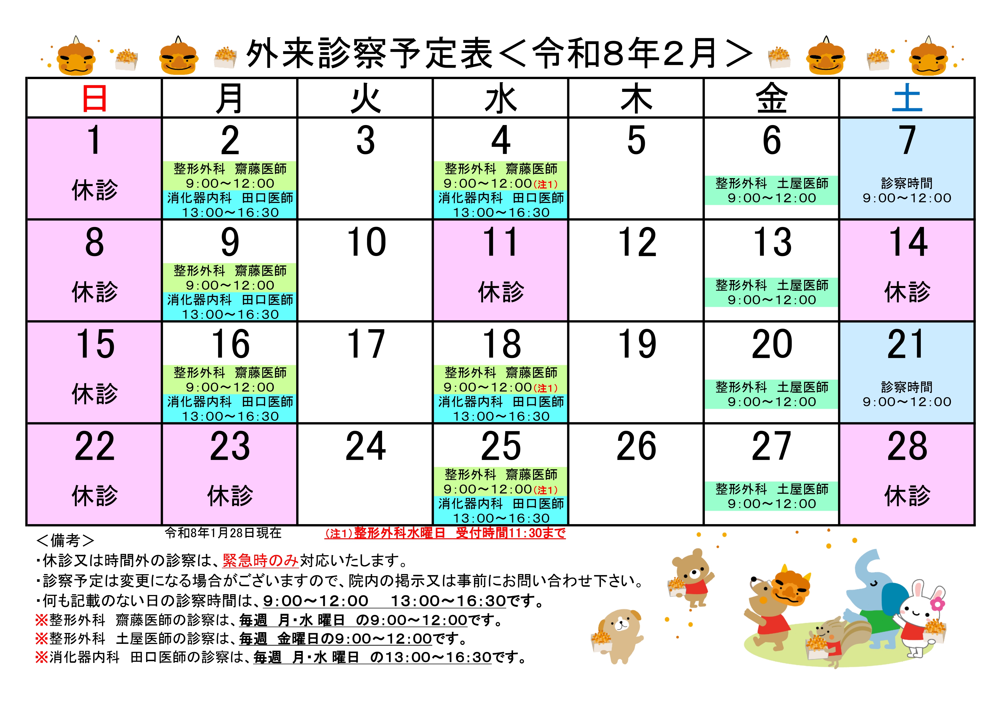 外来診察予定表 <令和8年2月>
