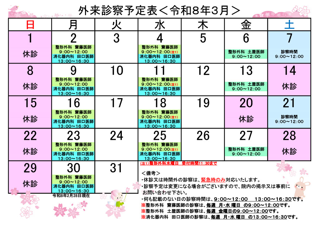 外来診察予定表 <令和8年3月>