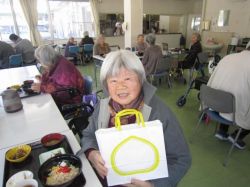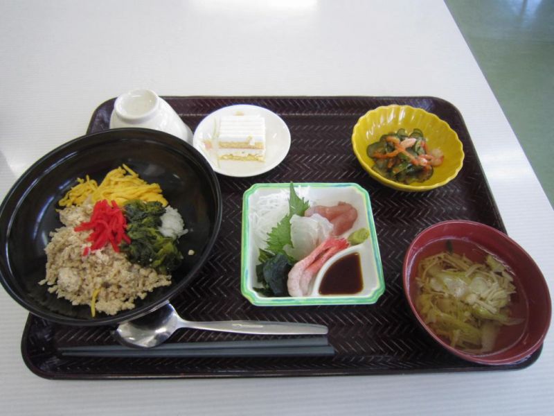 誕生会の昼食メニューは三食丼とお刺身とデザートにケーキがつきました